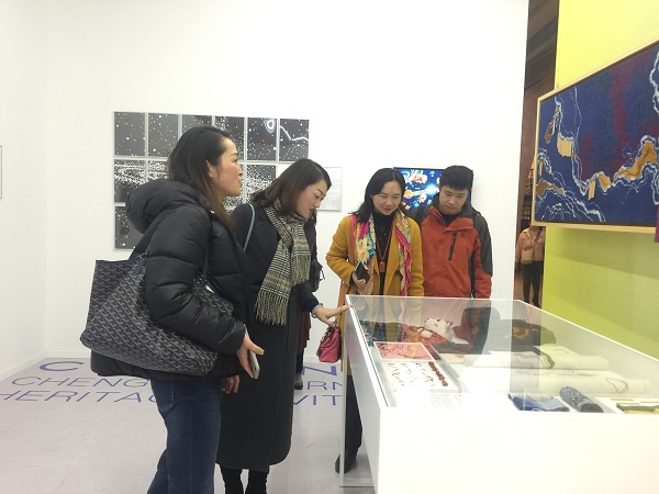 座谈后,李俊经理带领大家参观并介绍了方所书店正在开展的非物质文化遗产展,就蜀绣的编织与在世界上的衍生演变进行了详细的解说。